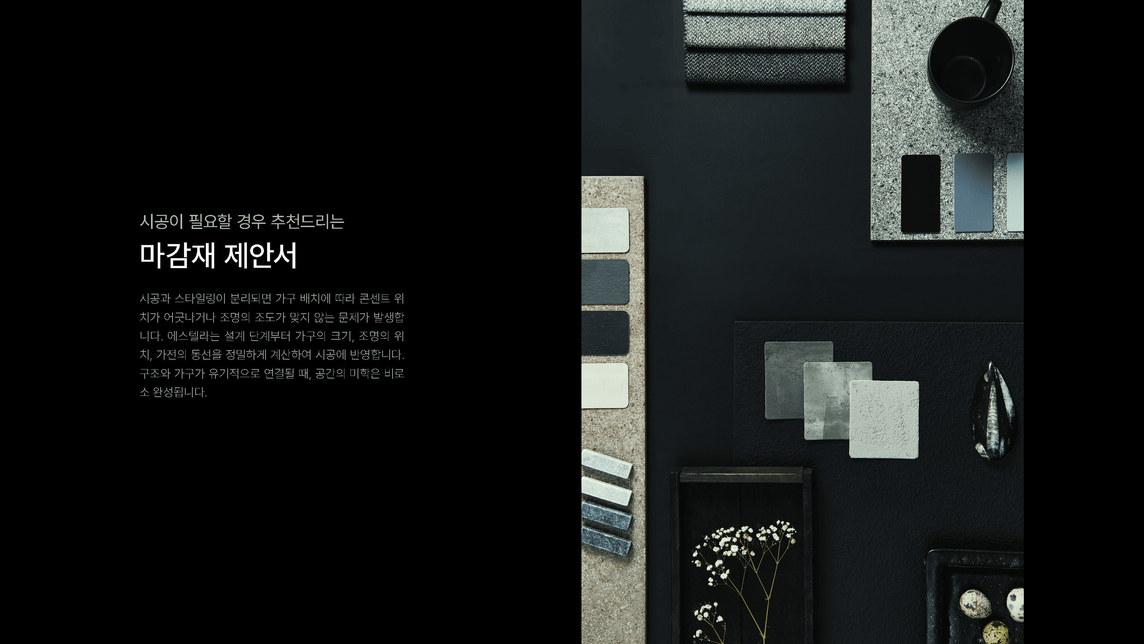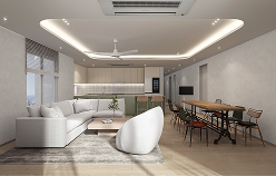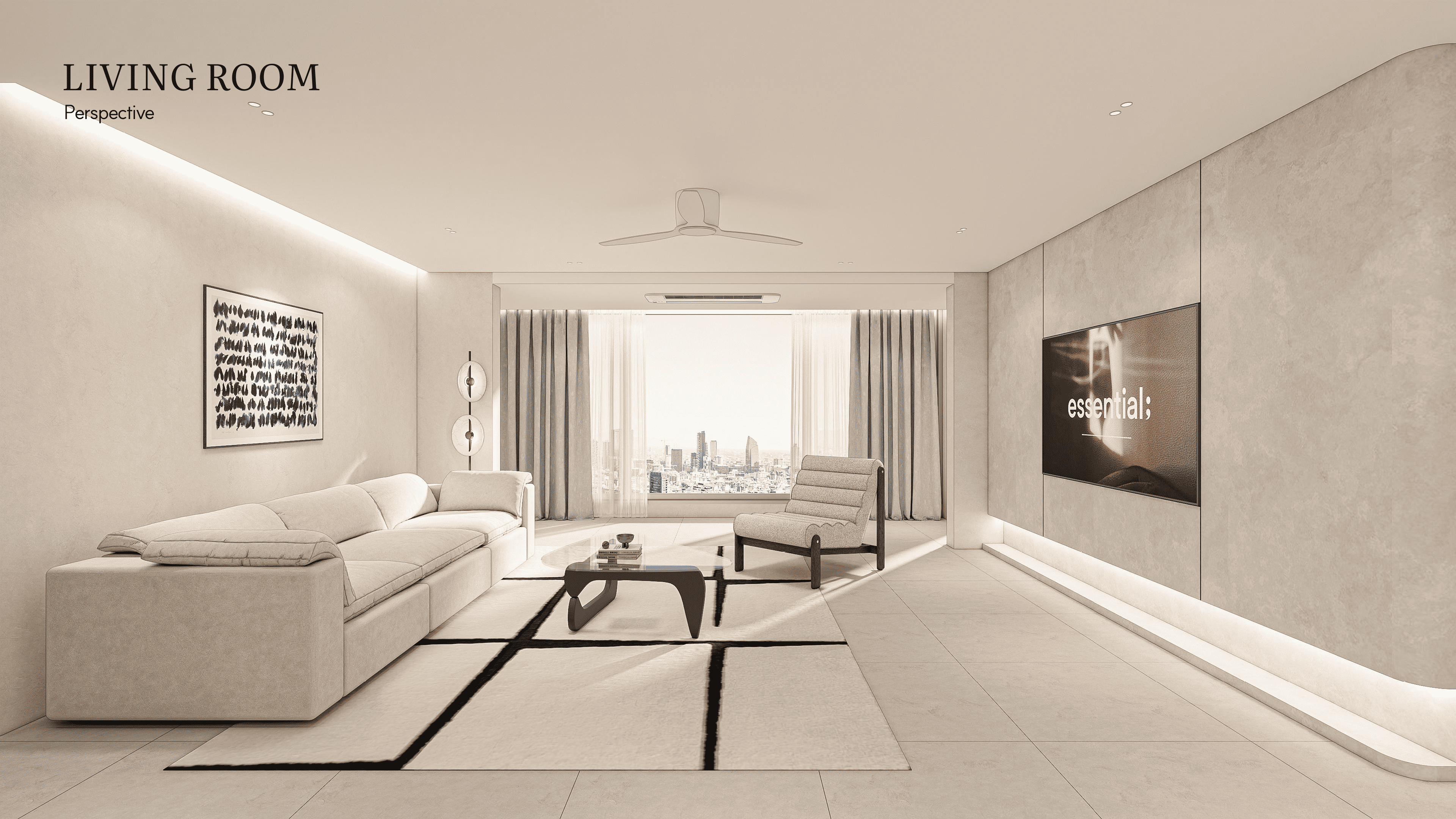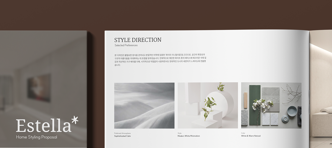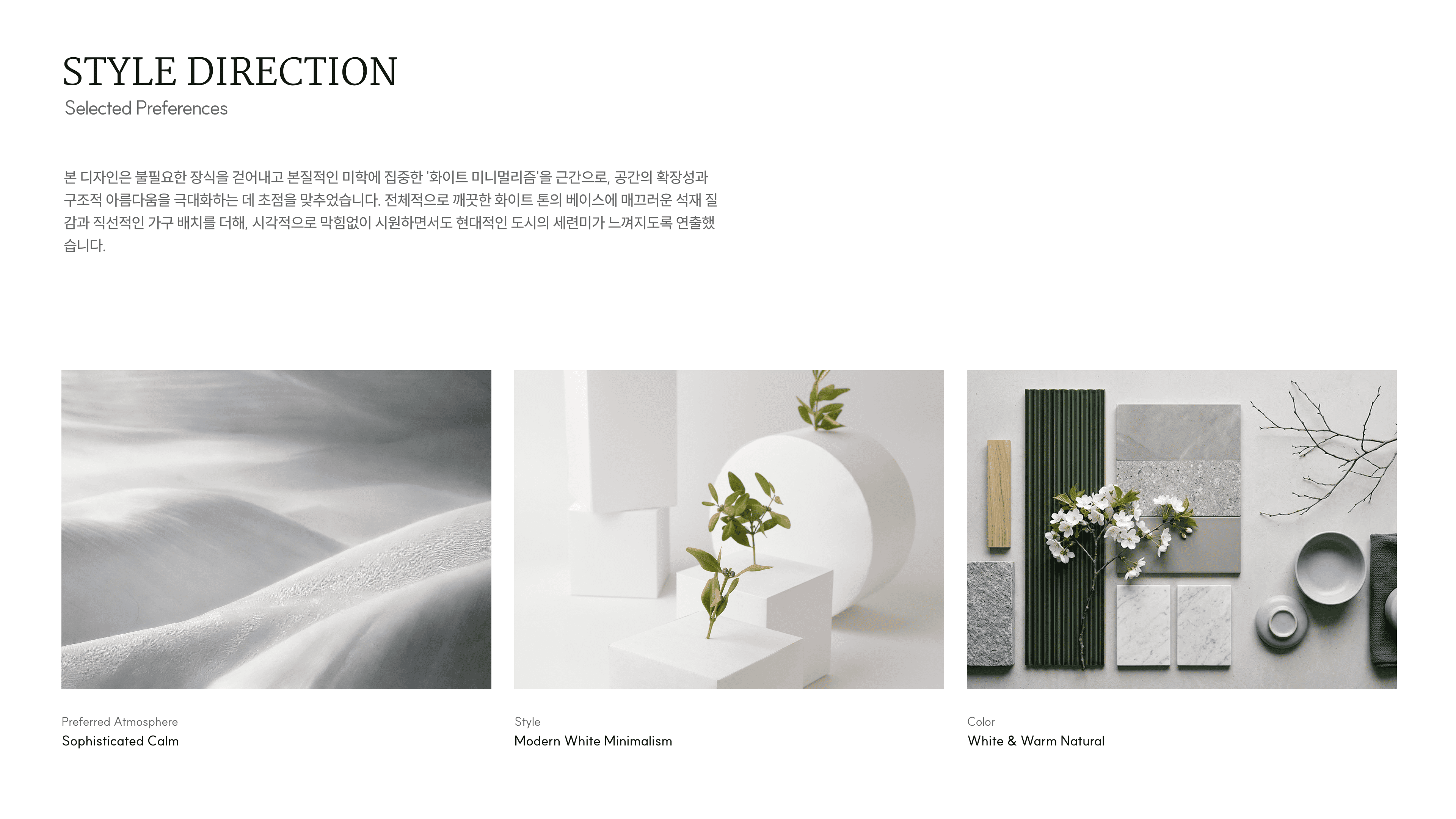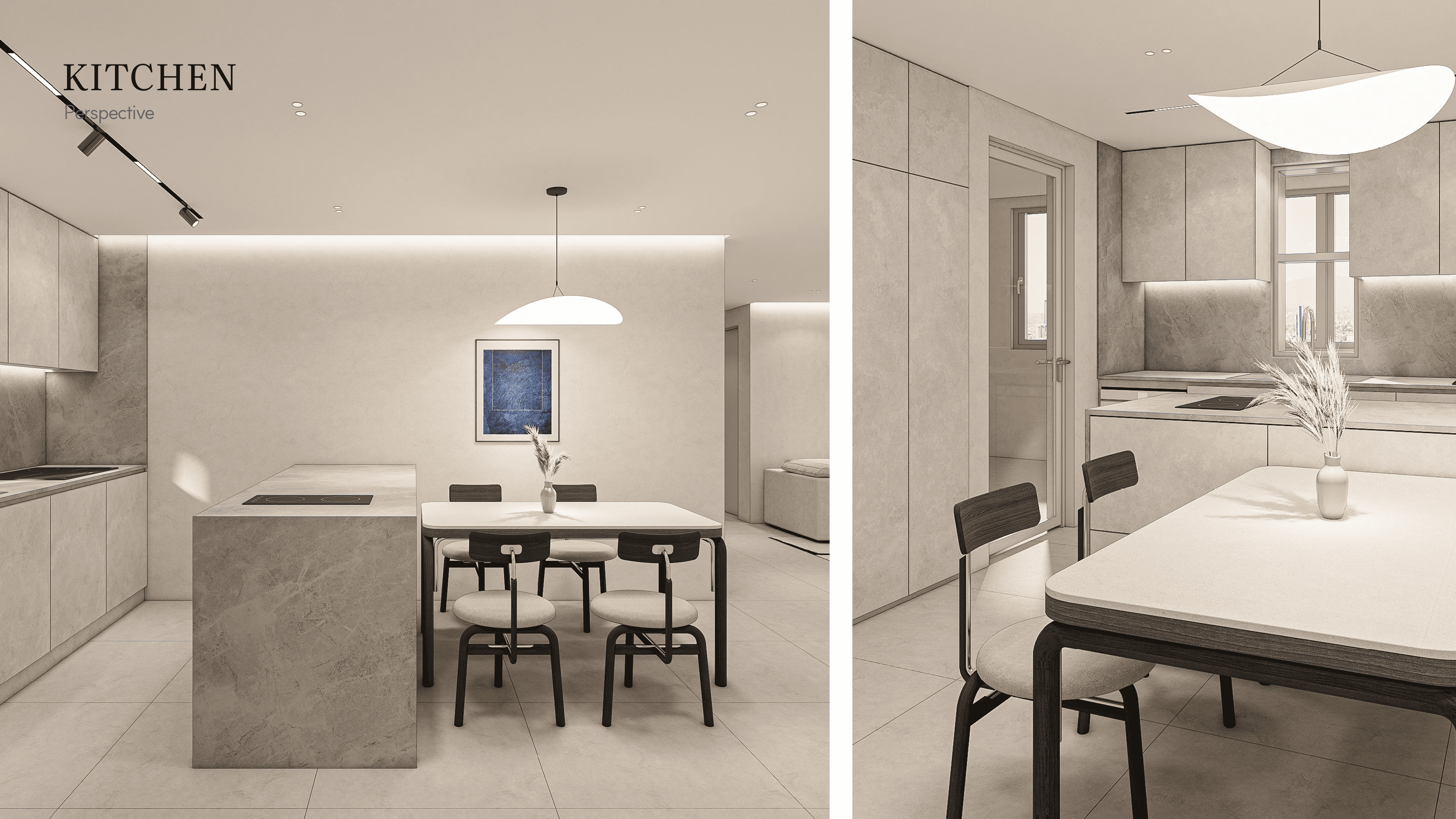 불필요한 장식을 걷어내고 본질적인 미학에 집중한 '화이트 미니멀리즘'을 근간으로, 공간의 확장성과 구조적 아름다움을 극대화하는 데 초점을 맞추었습니다. 전체적으로 깨끗한 화이트 톤의 베이스에 매끄러운 석재 질감과 직선적인 가구 배치를 더해, 시각적으로 막힘없이 시원하면서도 현대적인 도시의 세련미가 느껴지도록 연출했습니다.